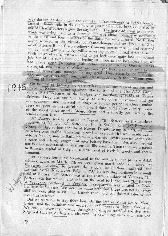The house adjacent to the gun, which was being used as a forward CP was almost completely destroyed by the blast and four members of the Battalion were injured. No further action occured in the vicinity of Francochamps and on December 31st, we of batteries B and C were relieved, from our present mission and returned on the 1st of January to Aywaille, reverting to our normal AAA mission.