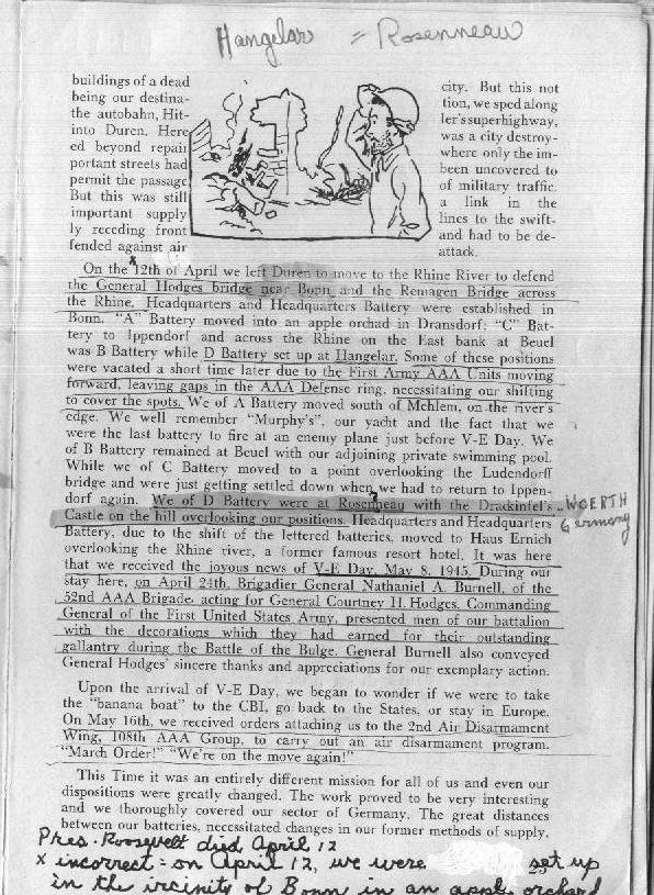 On the 12th of April we left Duren to move to the Rhine River to defend the General Hodges bridge near Bonn and the Remagen bridge across the Rhine. Headquarters and Headquarters Battery were established in Bonn.