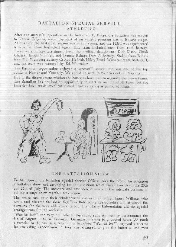 After our successful operation in the battle of the Bulge, the battalion was moved to Namur, Belgium, where the start of an athletic program was in its first stages. At this time the basketball season was in full swing, and the 143rd was represented with a Battalion basketballl team. This team included men from each battery. There were Jimmy Blessinger, from the medical detachment; Dick Olson, Chuck Olszeski, Ernest Stanifer, and Tommy Rehage from A Battery; Stokes from B Battery; Mel Weinberg Battery C; Ray Hendrick, Hiles, Frank Wikierak from Battery D, and the team was managed by Ed Whittaker.